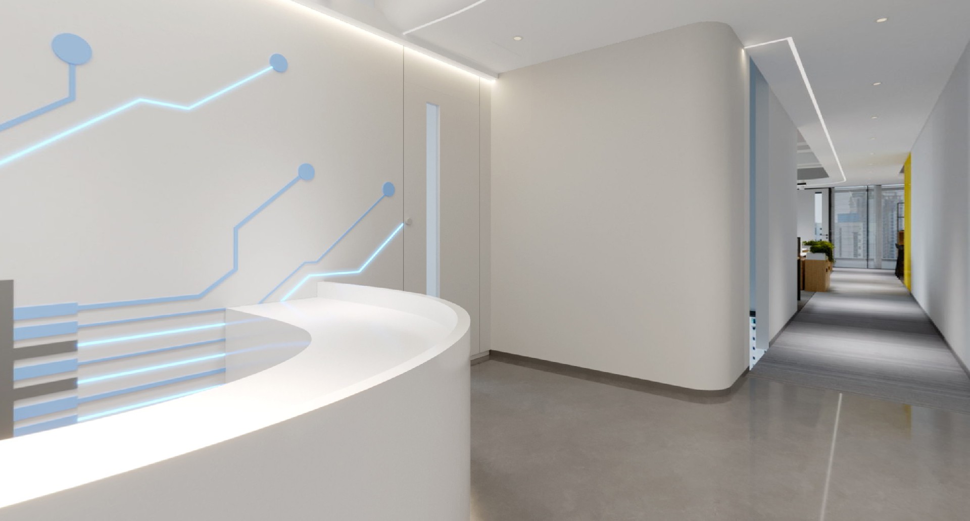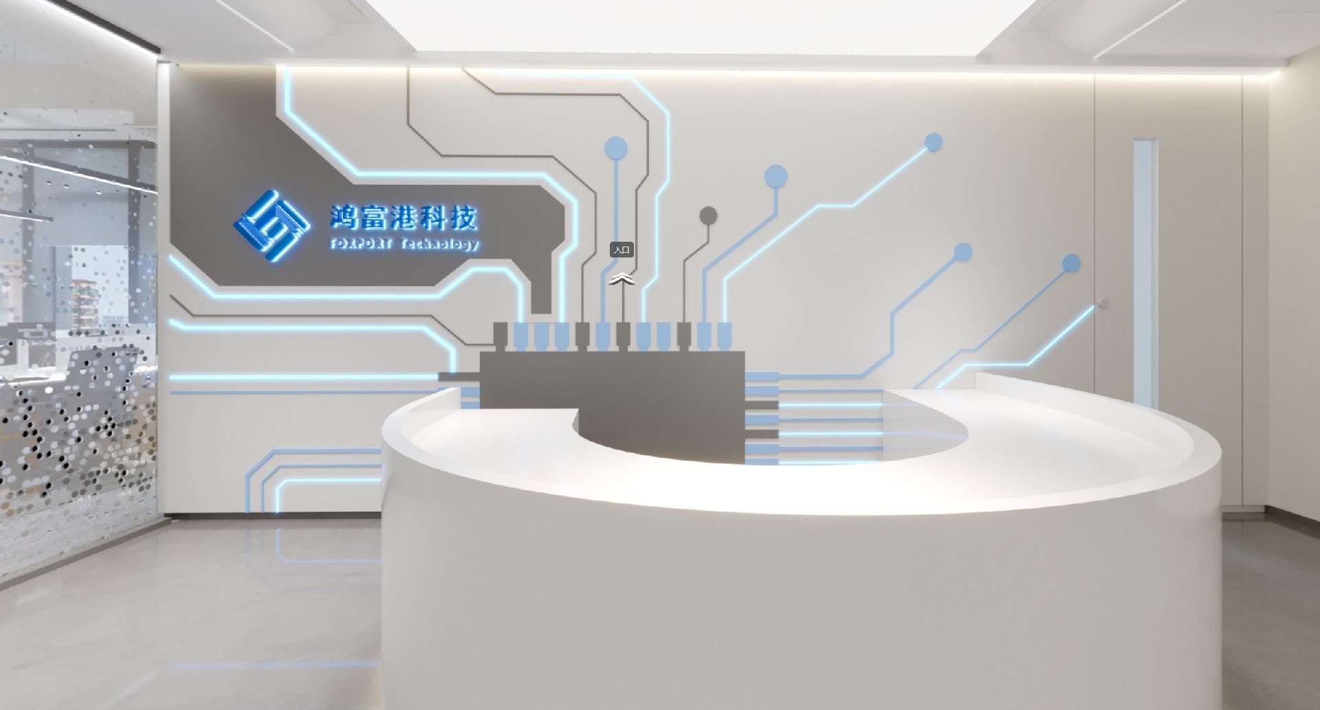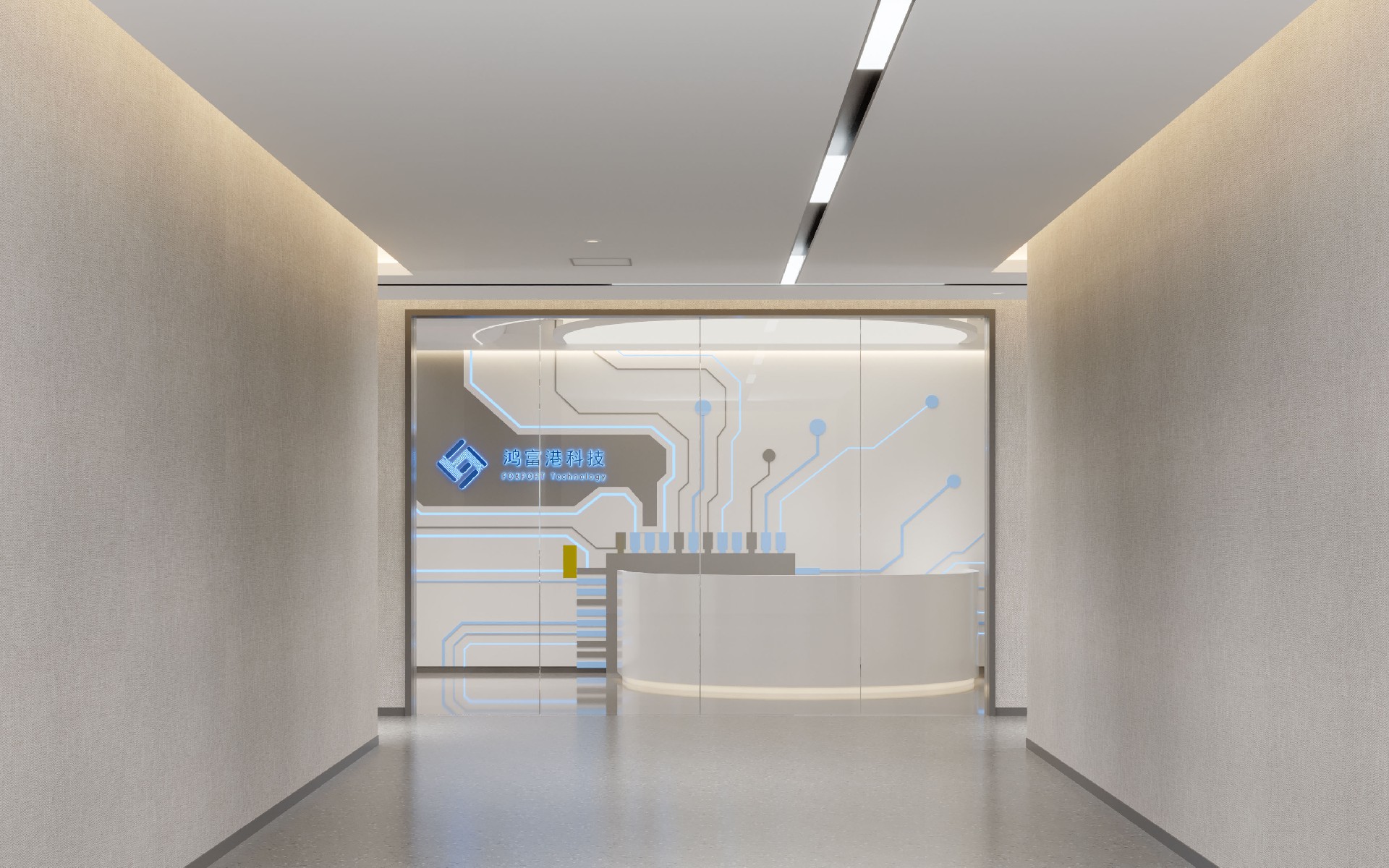 此办公空间设计围绕科技感与简约风展开。前台背景以电路板元素结合灯光,凸显 “鸿富港科技” 的行业属性。整体色调以白为主,搭配浅木色与科技蓝,营造简洁且具未来感的氛围。走廊线条流畅,灯光柔和,引导性强。办公区采用玻璃隔断,保证采光与空间通透,同时用绿植点缀增添生机。设计旨在打造一个高效、创新且富有科技氛围的办公环境,助力员工迸发灵感,提升工作效率。