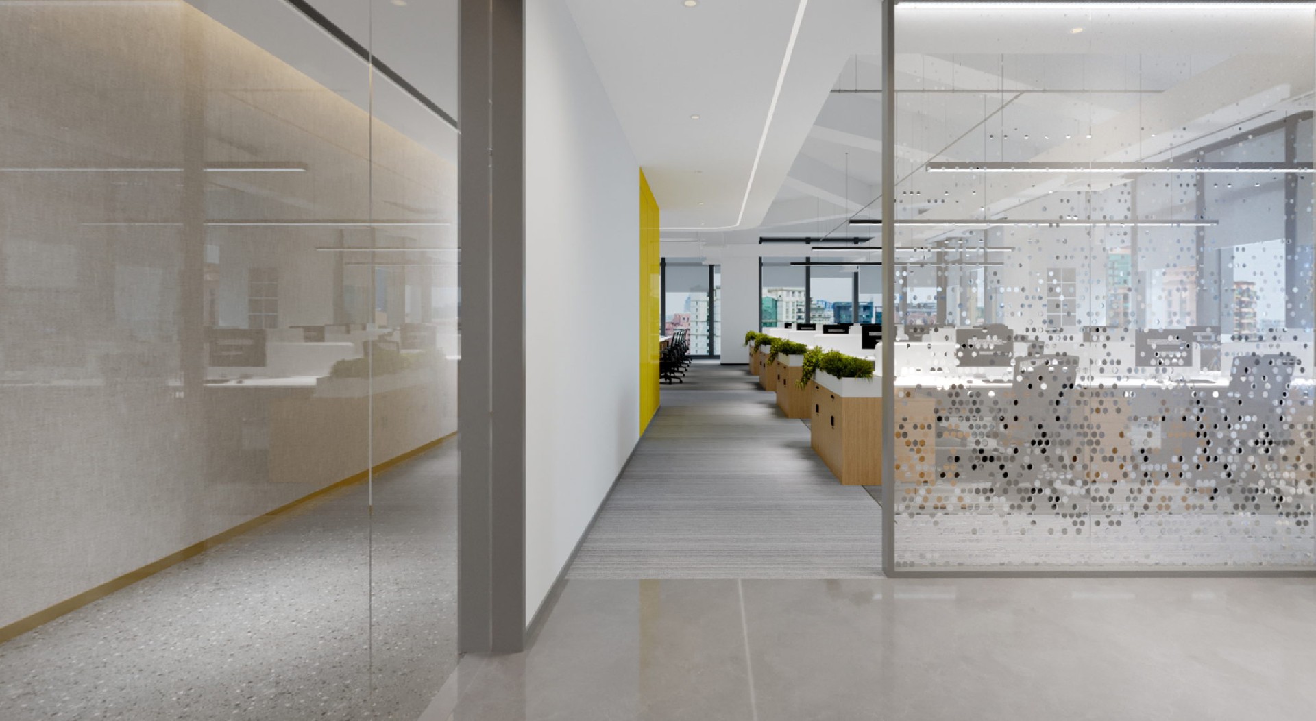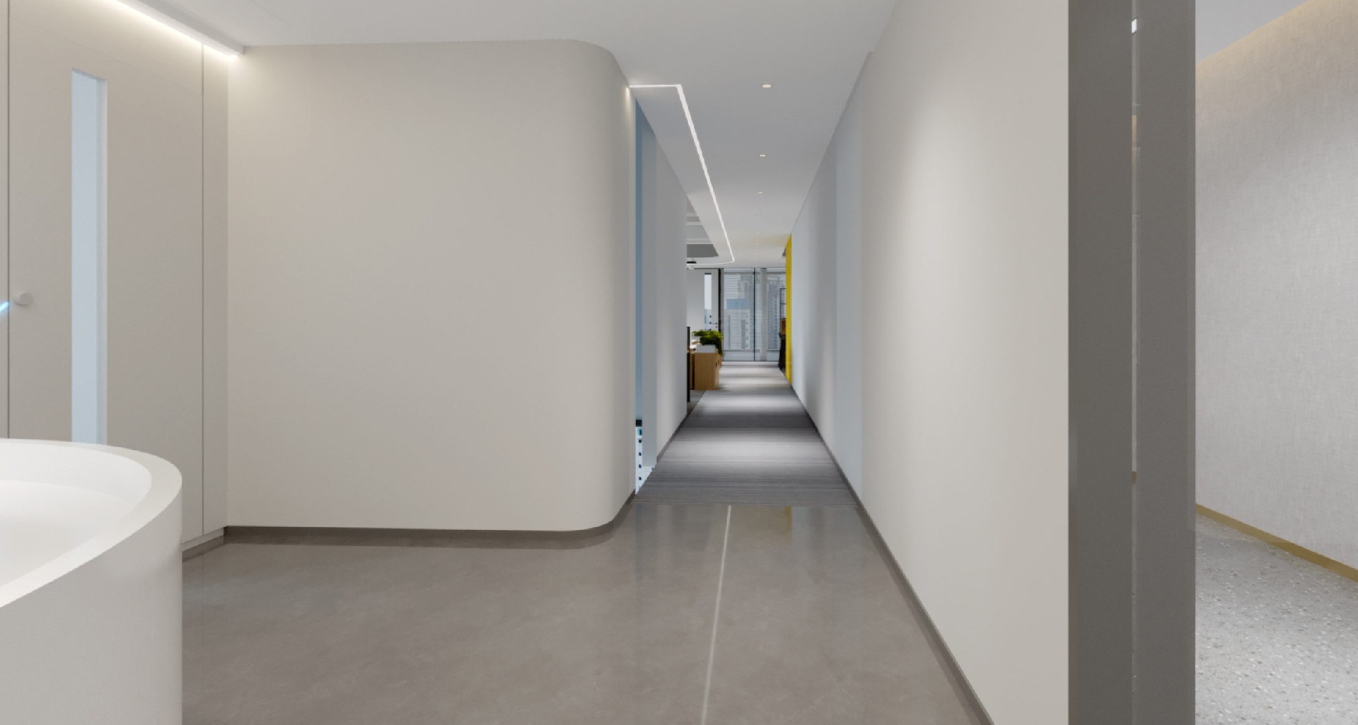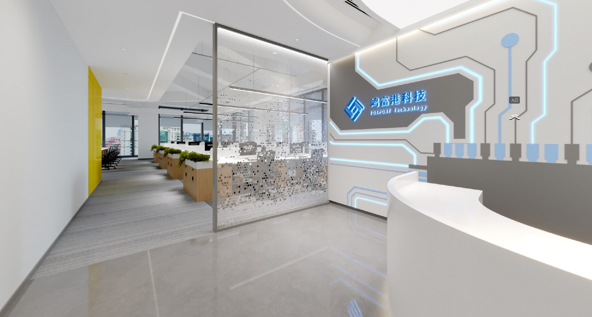 此办公空间设计围绕科技感与简约风展开。前台背景以电路板元素结合灯光,凸显 “鸿富港科技” 的行业属性。整体色调以白为主,搭配浅木色与科技蓝,营造简洁且具未来感的氛围。走廊线条流畅,灯光柔和,引导性强。办公区采用玻璃隔断,保证采光与空间通透,同时用绿植点缀增添生机。设计旨在打造一个高效、创新且富有科技氛围的办公环境,助力员工迸发灵感,提升工作效率。