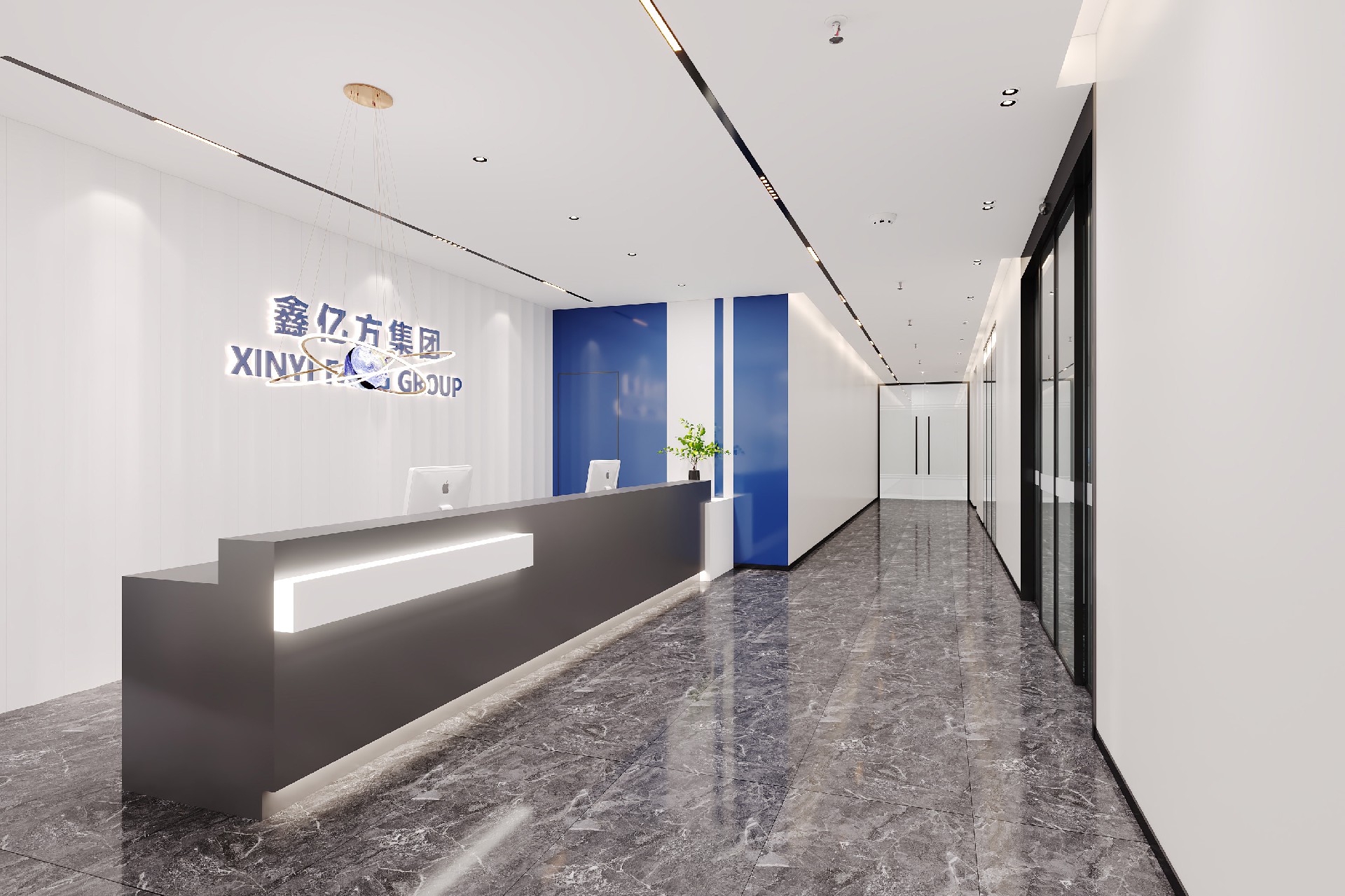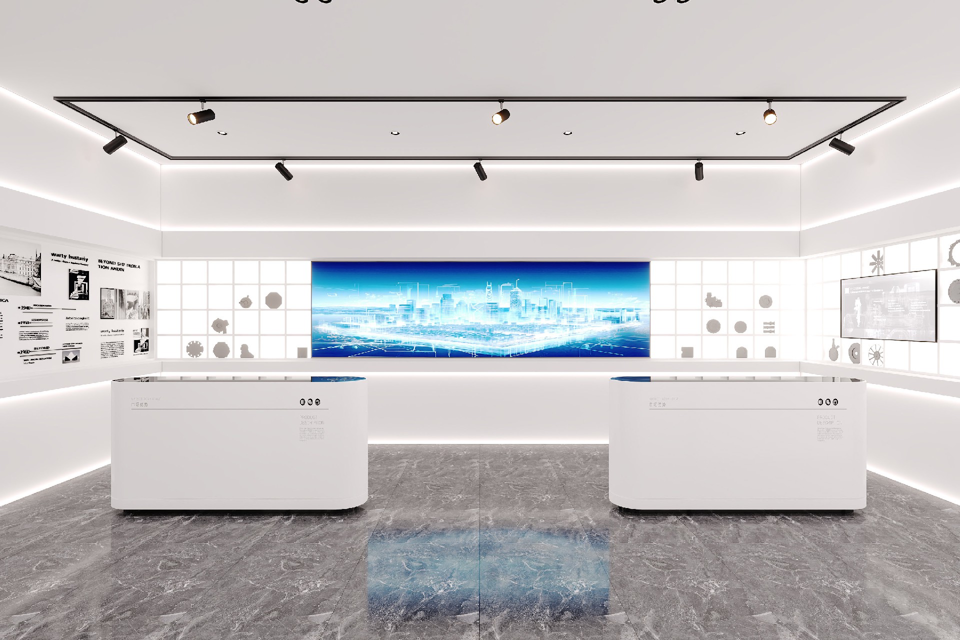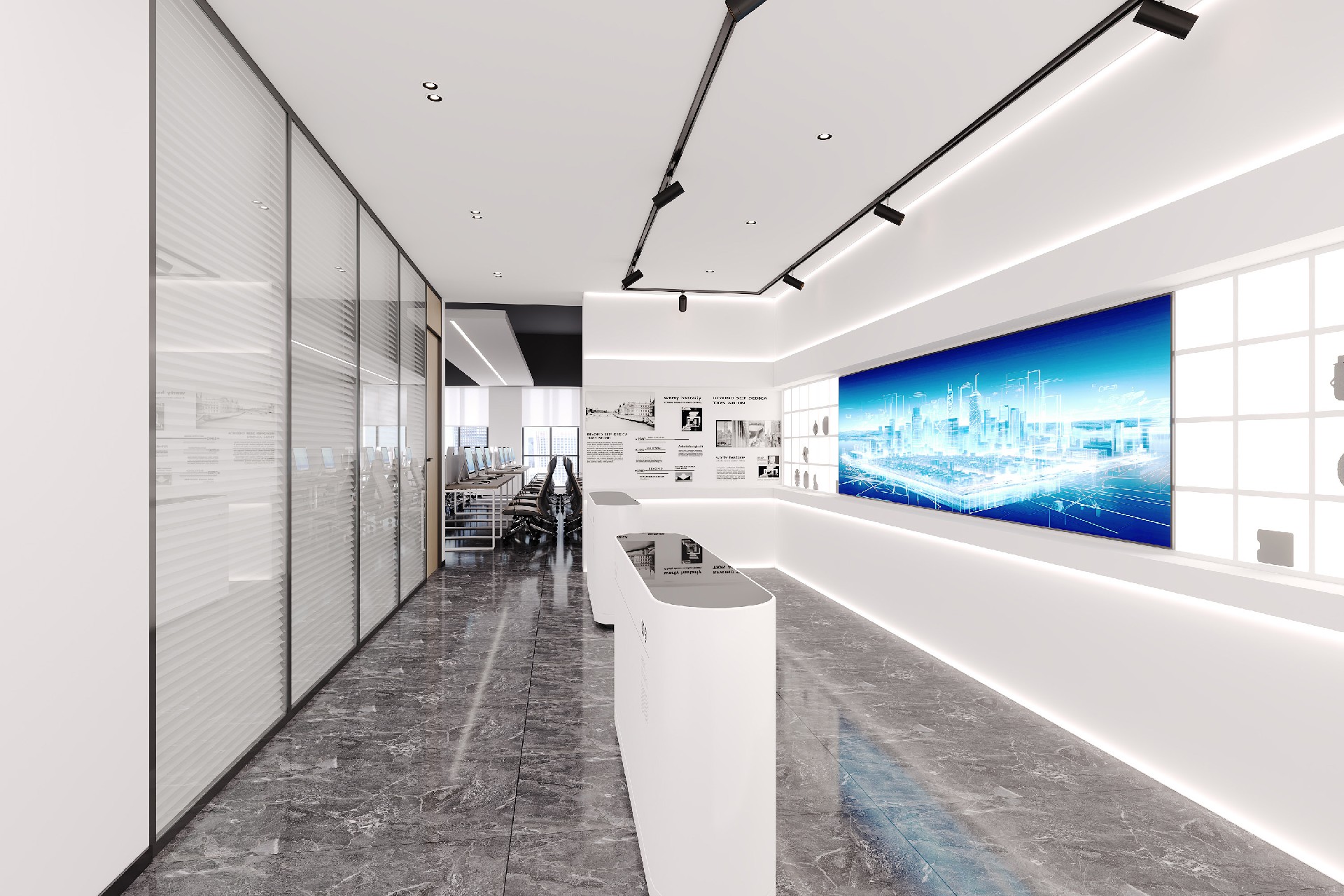 前台以深灰前台搭配发光品牌标识,第一眼便塑造清爽大气的企业形象;大面积玻璃隔断与大理石地面,延伸空间视野;科技展厅以线性灯带与纯白展柜,营造未来感展示氛围;总裁办公室则以温润木饰面与艺术陈设,打造沉稳高级的商务空间。整体以白、灰为主调,品牌蓝点缀,将专业、高效与科技感融入细节,为企业打造兼具形象力与实用性的现代化办公空间。