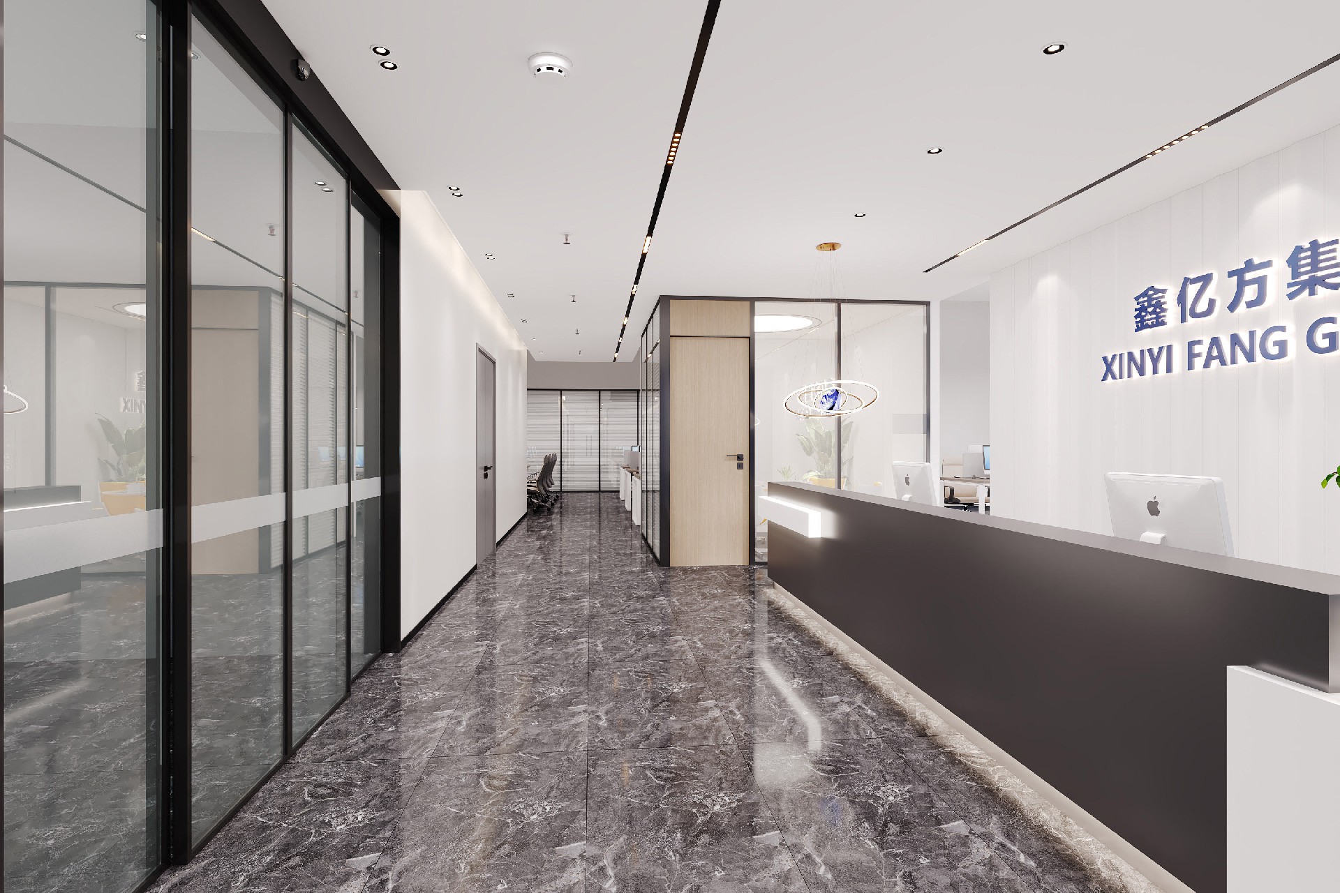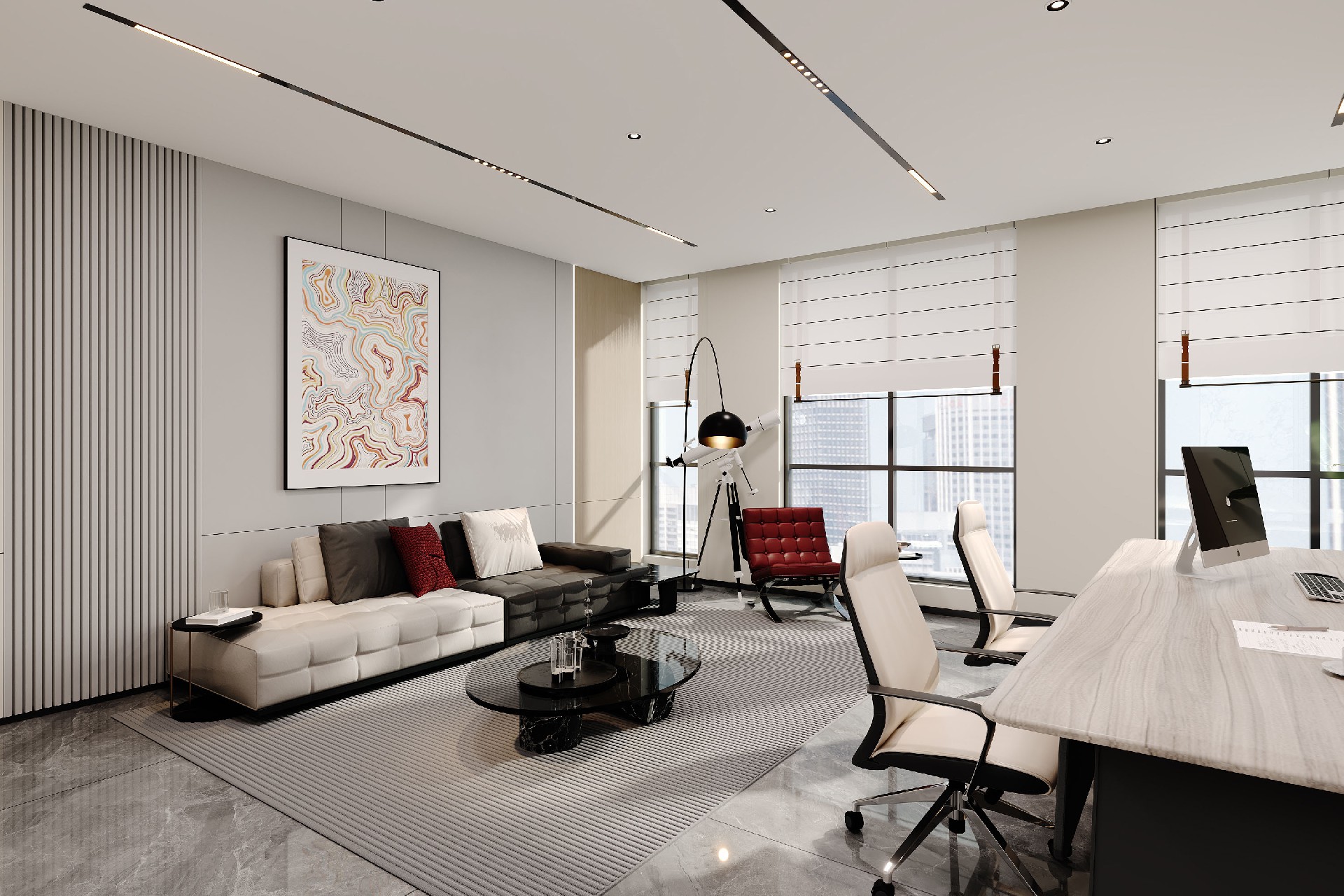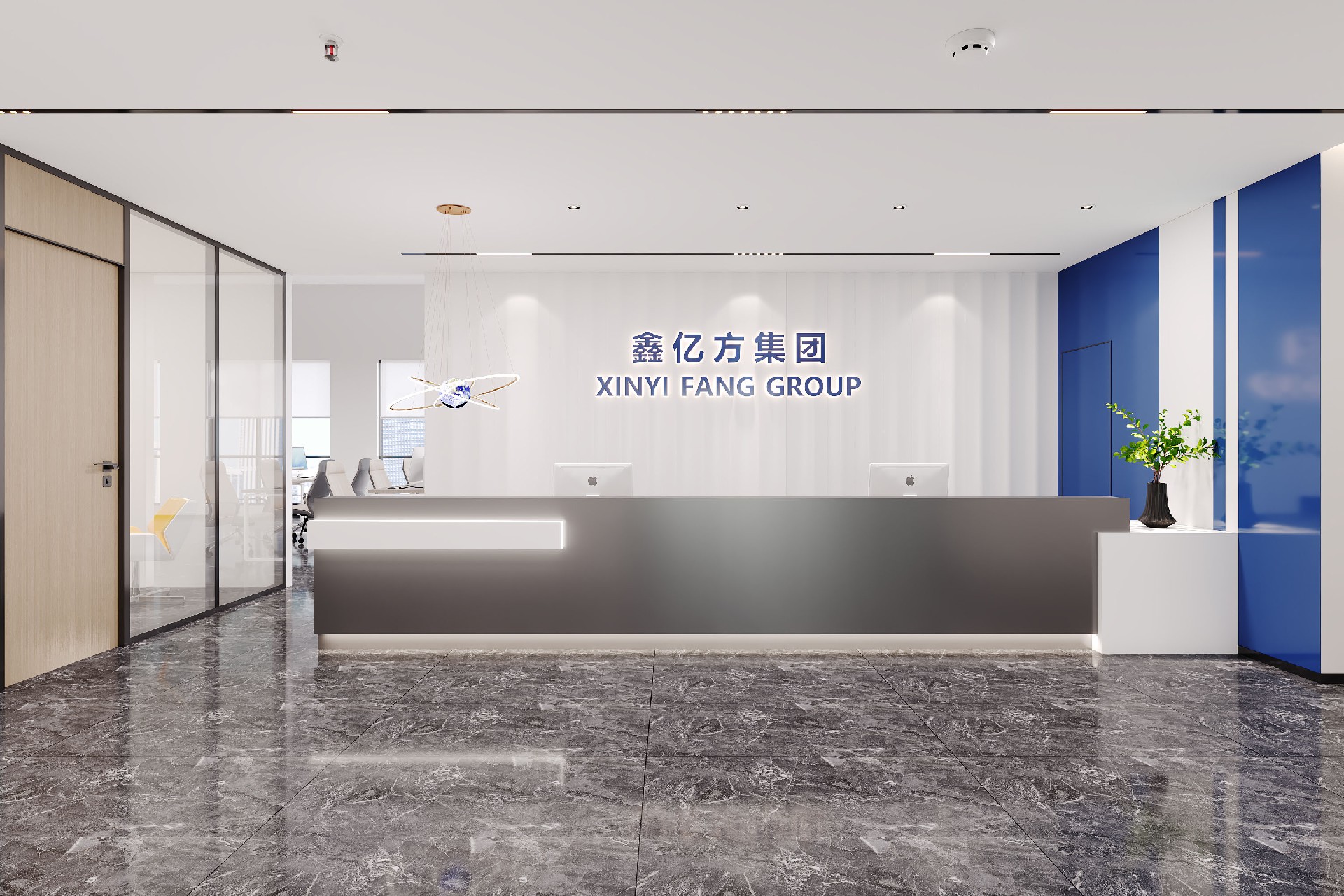 前台以深灰前台搭配发光品牌标识,第一眼便塑造清爽大气的企业形象;大面积玻璃隔断与大理石地面,延伸空间视野;科技展厅以线性灯带与纯白展柜,营造未来感展示氛围;总裁办公室则以温润木饰面与艺术陈设,打造沉稳高级的商务空间。整体以白、灰为主调,品牌蓝点缀,将专业、高效与科技感融入细节,为企业打造兼具形象力与实用性的现代化办公空间。