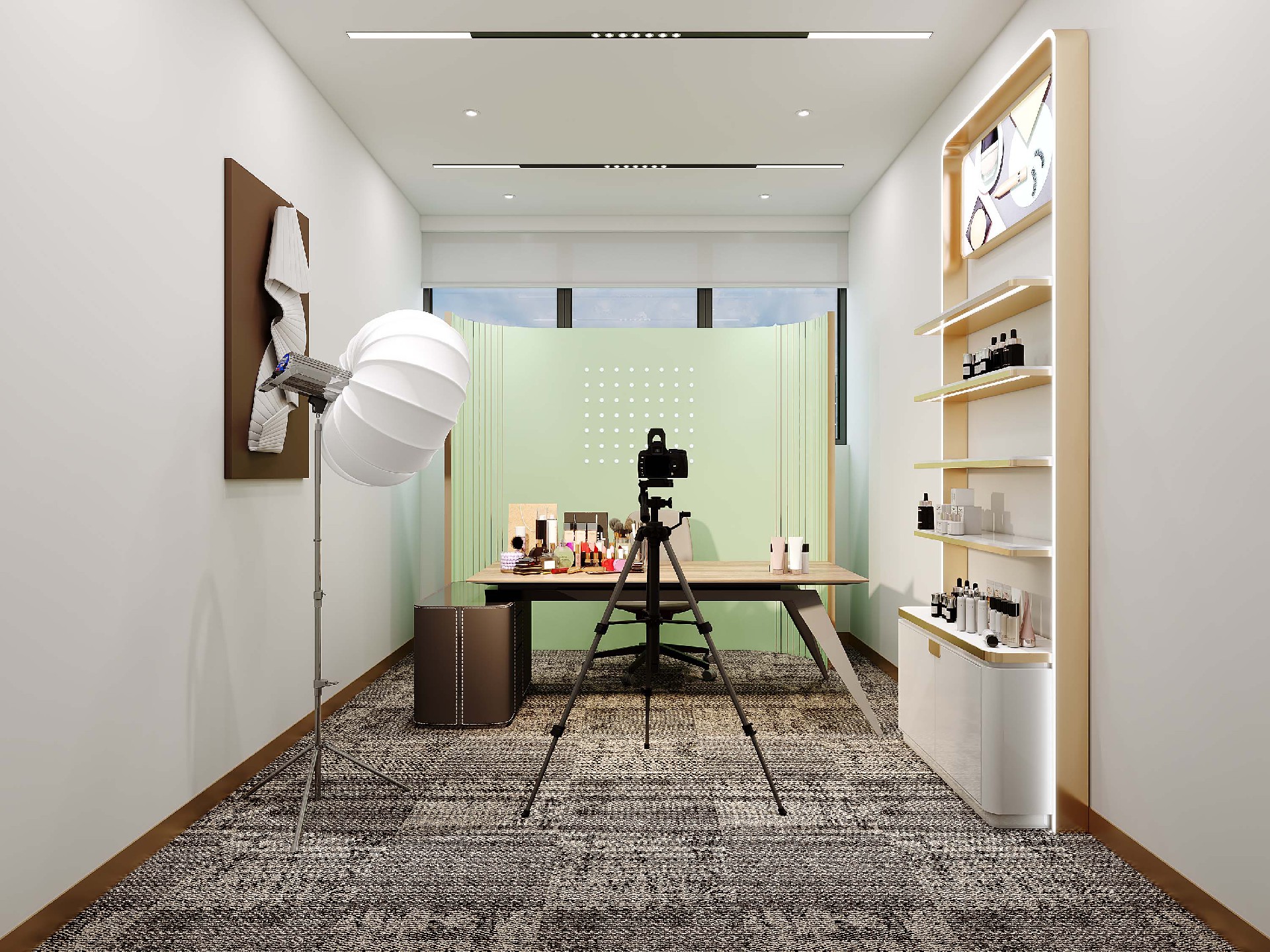 前台以弧形线条与渐变玻璃背景,第一眼便塑造大气精致的企业形象;开放办公区以裸顶管道与环形灯,打造通透高效的协作场景;会议室、直播间与总裁办公室,延续木色与浅灰主调,搭配柔和灯光,营造专业舒适的商务氛围。整体将现代简约的利落线条与轻奢质感完美融合,为企业打造兼具形象力与实用性的现代化办公空间。