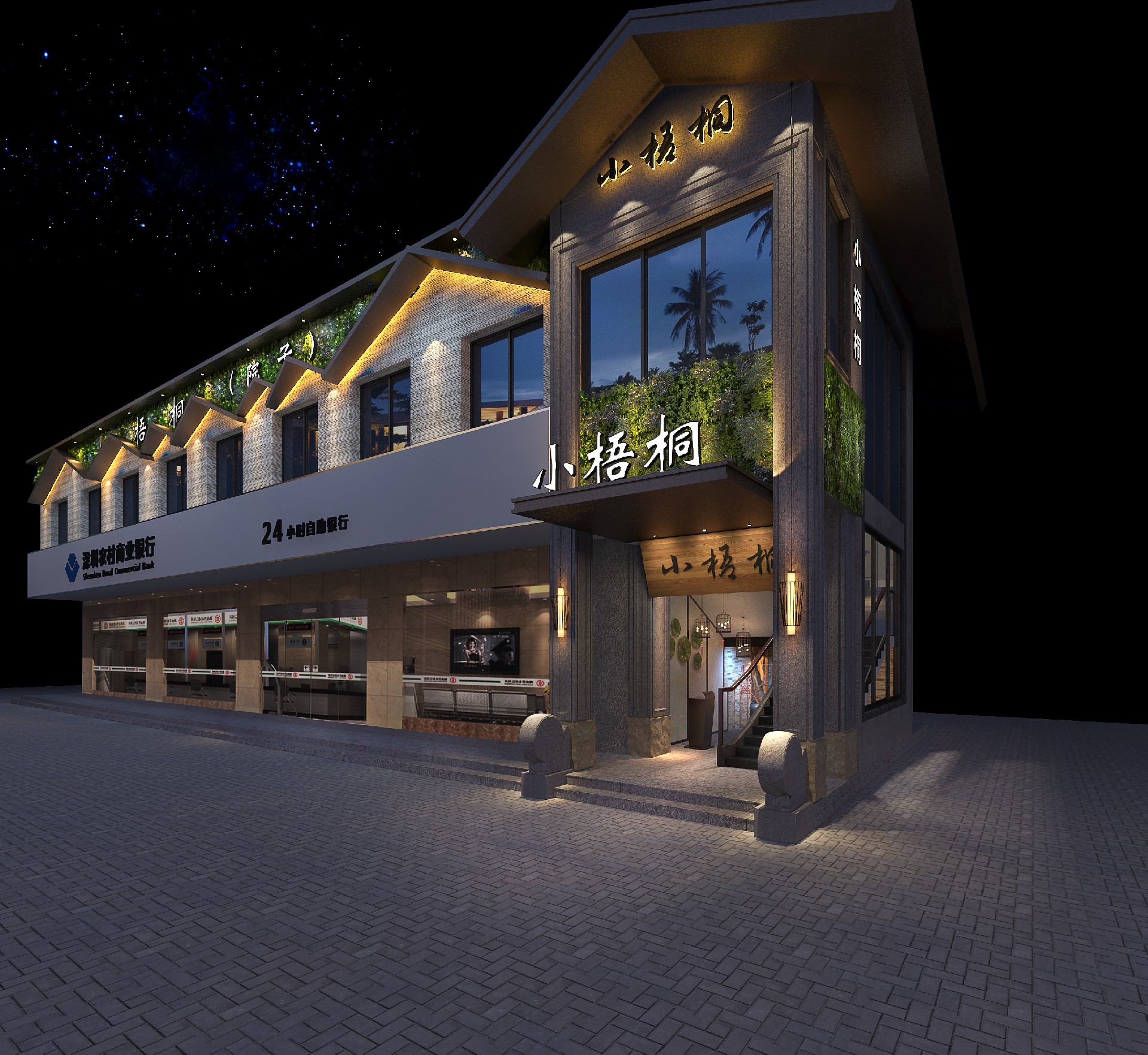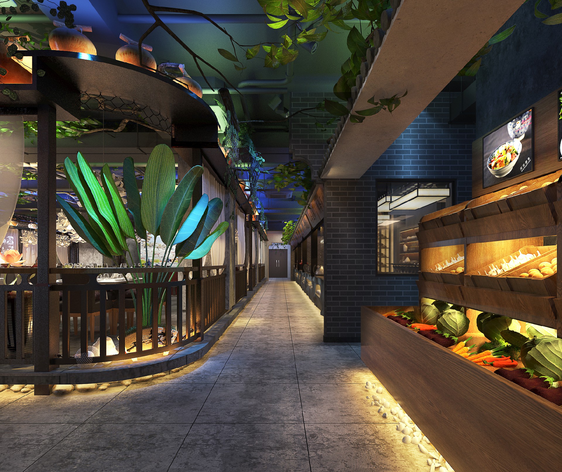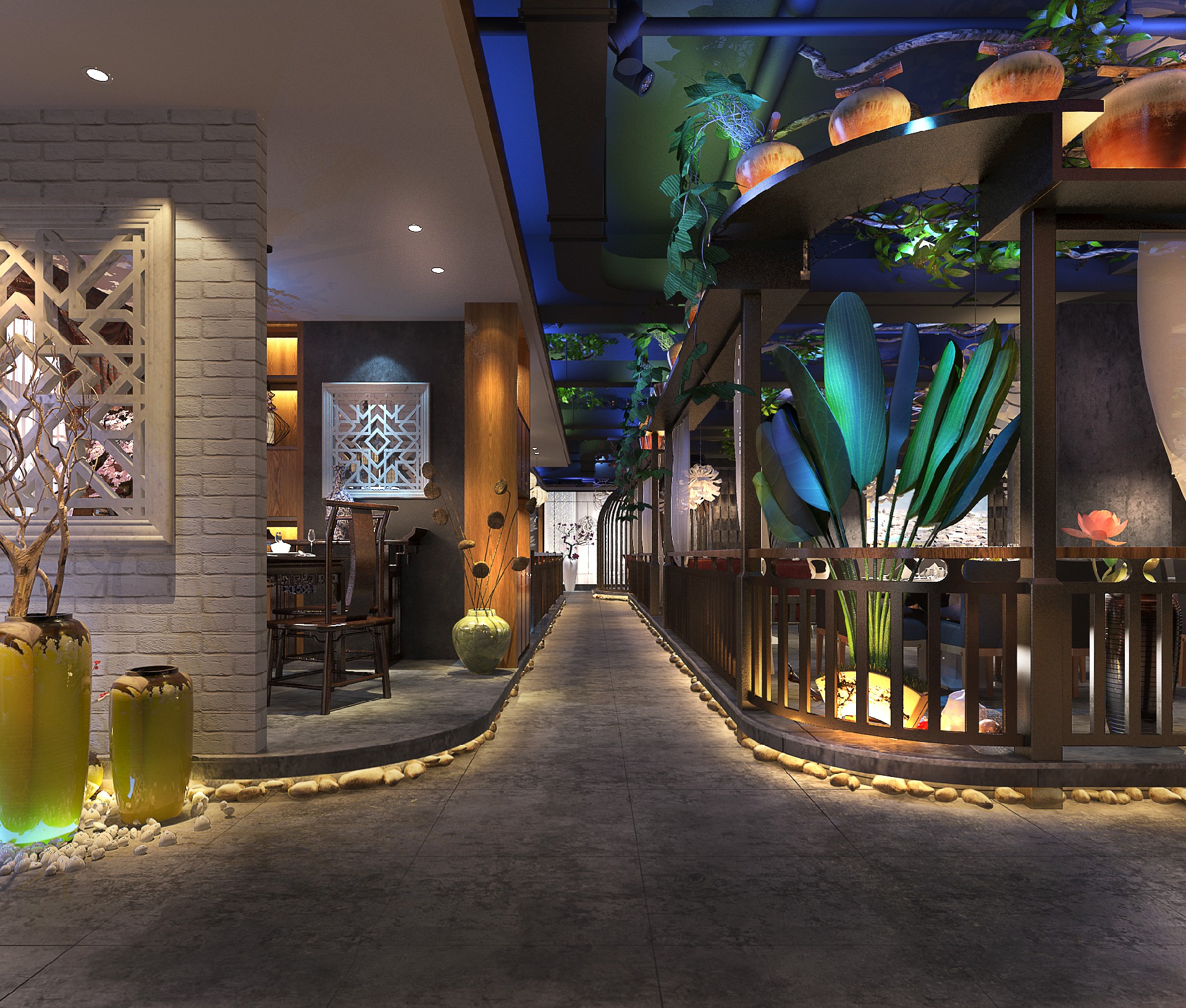 外立面以坡屋顶与绿植墙营造自然氛围,室内通过鸟笼灯、木质隔断与水景装置,将江南园林的雅致韵味融入用餐场景;绿植吊顶、竹编吊灯与鸟笼包厢,让顾客仿佛置身于山林庭院之中;包间则以古色古香的红木家具与花鸟挂画,彰显东方餐饮的文化底蕴。整体将传统中式元素与自然生态完美融合,为食客打造兼具文化感与松弛感的用餐环境。