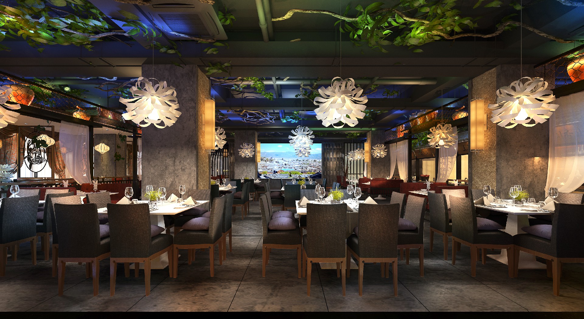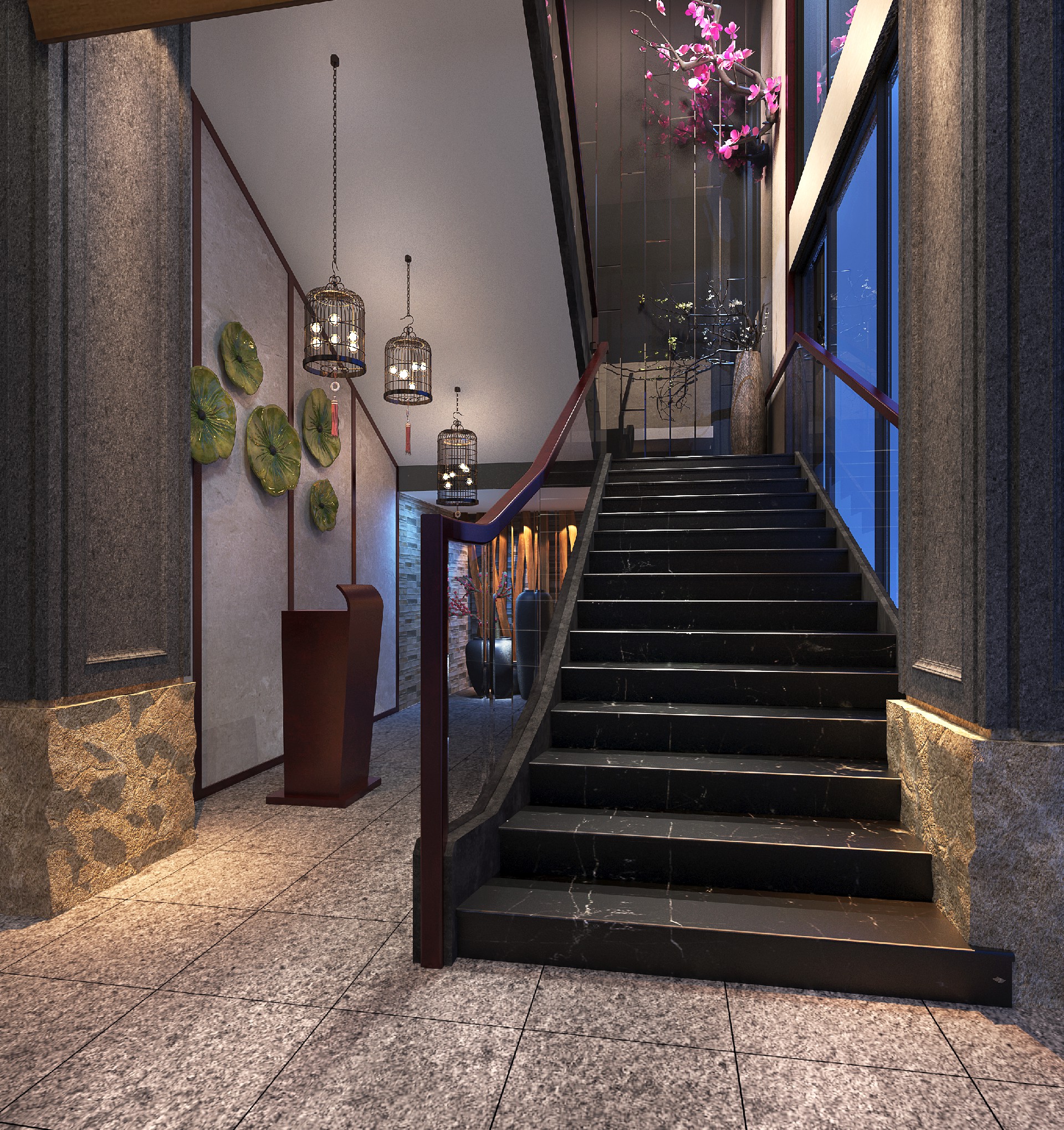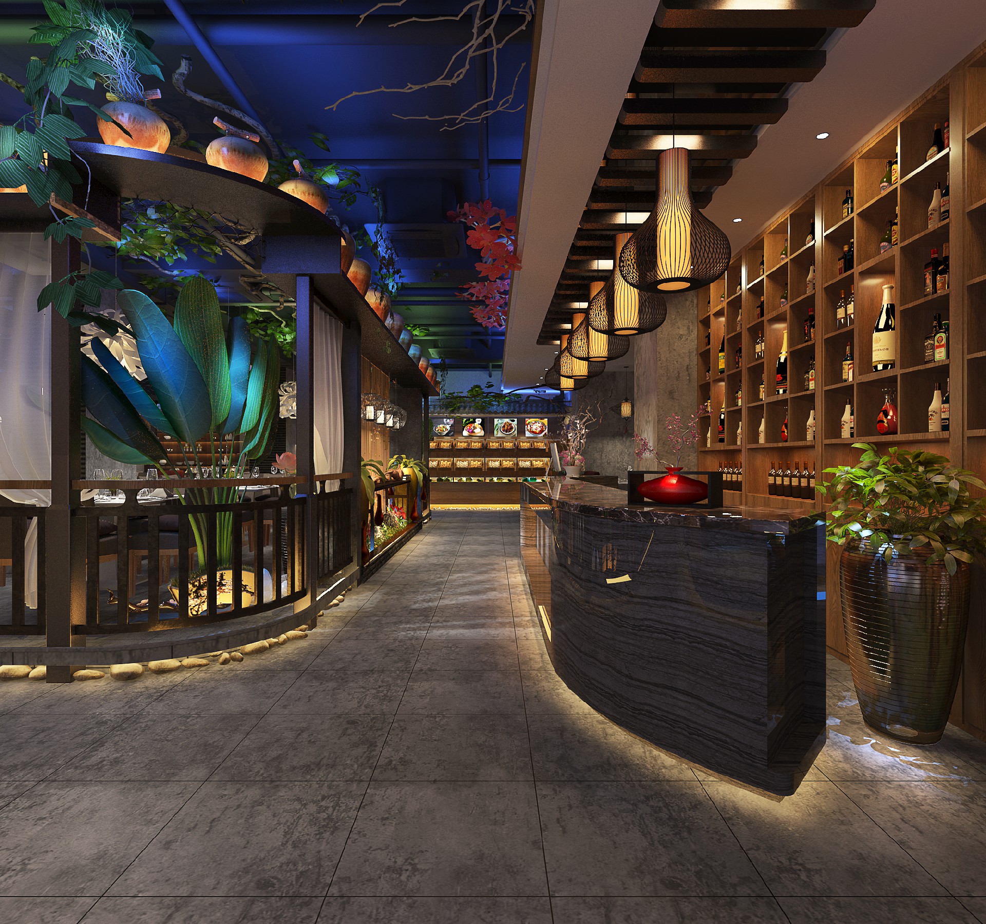 外立面以坡屋顶与绿植墙营造自然氛围,室内通过鸟笼灯、木质隔断与水景装置,将江南园林的雅致韵味融入用餐场景;绿植吊顶、竹编吊灯与鸟笼包厢,让顾客仿佛置身于山林庭院之中;包间则以古色古香的红木家具与花鸟挂画,彰显东方餐饮的文化底蕴。整体将传统中式元素与自然生态完美融合,为食客打造兼具文化感与松弛感的用餐环境。