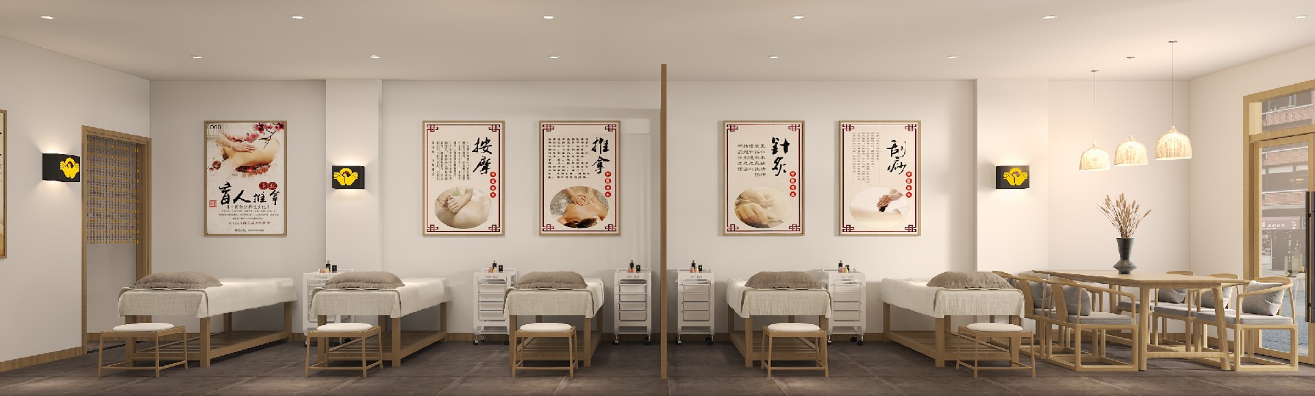 弧形前台与格栅背景墙第一眼便传递出温暖的品牌温度;开放式理疗区与独立包间,通过半透隔断实现空间分区,既保证私密性,也让光线柔和流动;墙面的养生文化挂画与品牌标语,呼应中医理疗理念,让顾客在舒适放松的环境中,享受专业的按摩服务。整体设计以简约禅意诠释疗愈空间的核心,为每一位顾客打造治愈身心的休憩港湾。