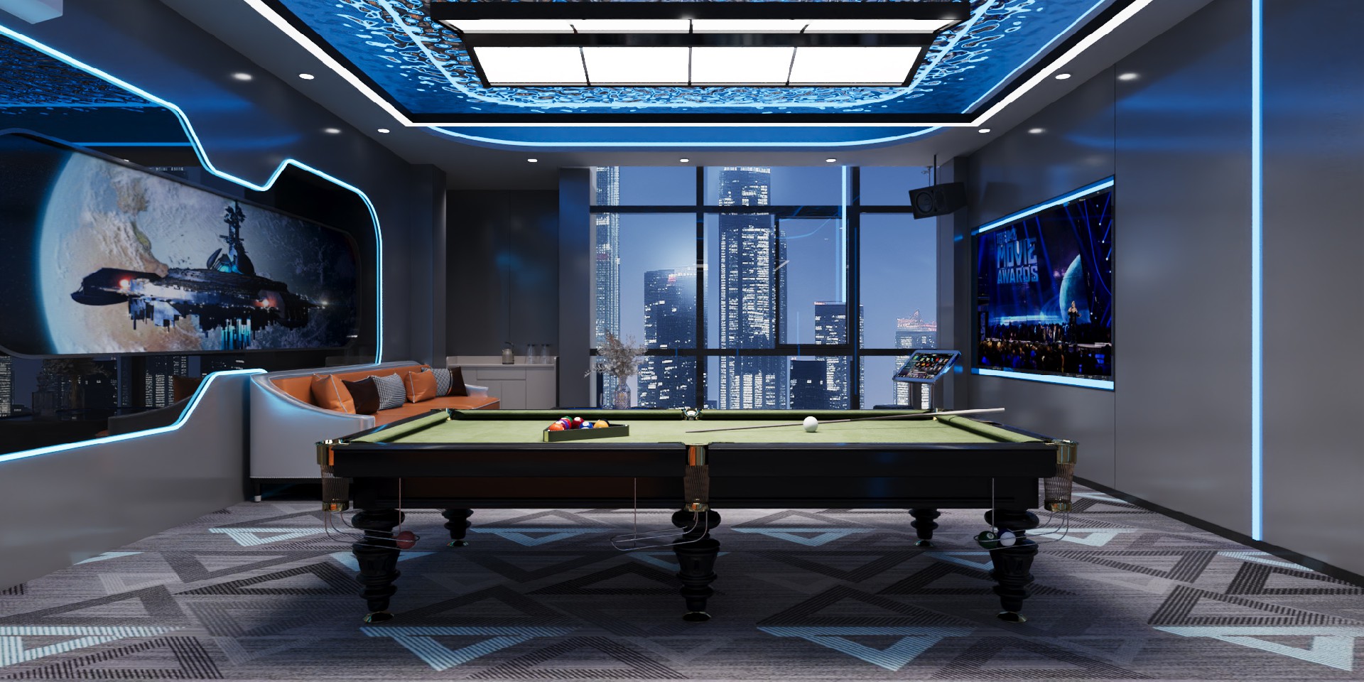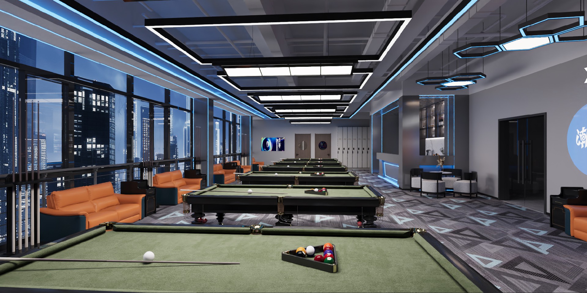 光影一触,解锁属于你的潮玩主场。本项目为现代赛博工业风台球俱乐部,以冷调灰为基底,搭配霓虹蓝灯带与活力橙软包,打造潮酷又舒适的娱乐空间。
